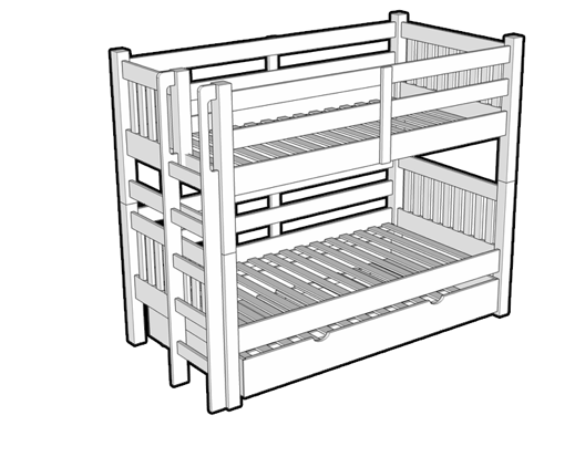 •Lit gigogne de format simple sur roulettes sous le lit inférieur.