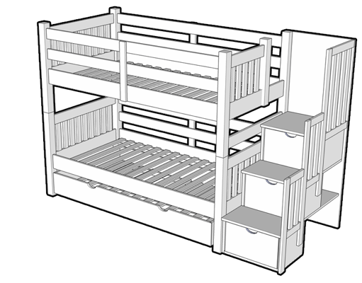 •Lit gigogne de format Simple sur roulettes sous le lit inférieur.